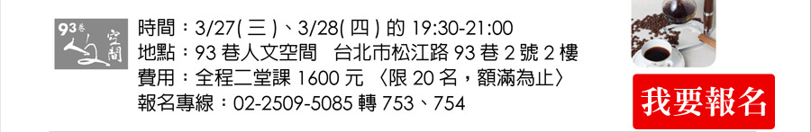 pyright © 93巷人文空間 人文薈萃的新地標 | 台北市松江路93巷2號1樓 | Tel: (02) 2509-5085 # 753. 754