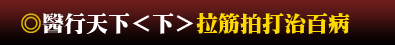 拉筋:黃帝內經裡這麼寫著:「筋長一寸,壽延十年」。身體因筋縮而導致的各種毛病,可藉拉筋療癒百分之五十到百分之百,是「轟炸式」大範圍療法。拉筋同時配合醫生的手法正骨,可更徹底的處理痛症與相關疾病。