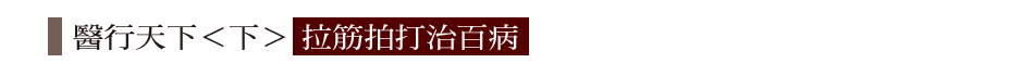 我重點介紹大家不太熟悉、但卻很有效的幾種療法,即拉筋、正骨和拍打。大量臨床經驗表明,多數常見病僅用拉筋、拍打、正骨和點穴就可治好。如果加上針灸,則治療範圍更廣。即使用其他療法,仍然可以用這些方法配合。服中藥的人在服藥期間拉筋、拍打,則藥的療效會更好、更快,藥的劑量也可相對減少。所謂「亞健康」其實就是不健康,中醫通過拉筋、拍打和望、聞、問、切就能準確診斷,但西醫往往查不出病因,故曰「亞健康」。亞健康者經常使用這些療法,有很好的治療和預防功能!因正骨需要專門訓練,且必須由他人施治,不便推廣;所以拉筋、拍打之法,便成為我向大眾推薦的首要療法。