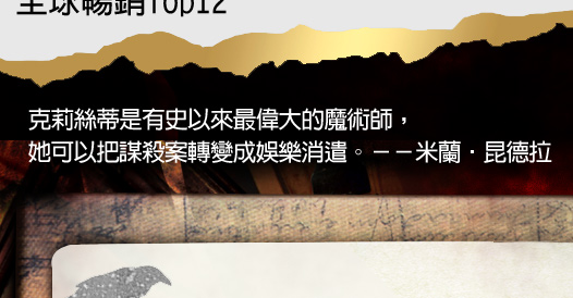 | 一首純真的童謠竟被當作恐怖的殺人暗示、東方快車上一宗離奇命案,竟有12個人聯手、一個冷血殺手竟是按著ABC順序連續殺人……這些膾炙人口的小說,你聽說過嗎?全世界有三分之一的人閱讀阿嘉莎•克莉絲蒂!您是其中之一嗎?認識謀殺天后阿嘉莎•克莉絲蒂,就從這裡開始吧!
