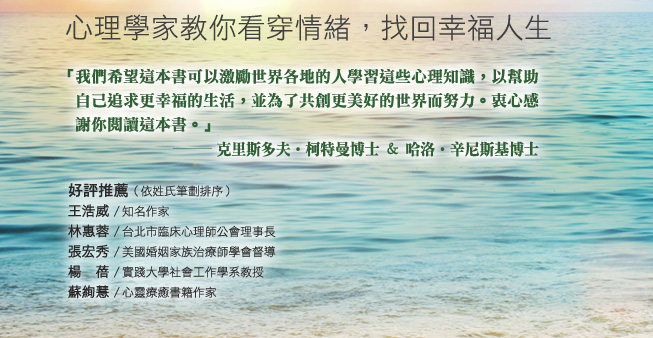 克里斯多夫 • 柯特曼博士(Dr. Christopher Cortman)柯特曼博士在美國佛羅里達州執業長達26年,身為一名專業的臨床心理學家,他樂於在診療及演講的過程中,分享心理相關的重要觀念,助人順利理解並解決個人生活大小事,大受民眾歡迎,也促使他在個人診所、到府診療,以及五間當地醫院提供心理諮詢服務超過50,000小時。他還擔任政府和執法機構的心理顧問,並經常以專家證人的身分,出席民事和刑事法庭作證。 哈洛 • 辛尼斯基博士(Dr. Harold Shinitzky)辛尼斯基博士在佛羅里達州私人診所執業,過去曾擔任約翰•霍普金斯大學醫學院兒科系評估/預防性治療服務小組的主任,目前亦擔任數個國家、州立、縣立單位的專業諮商顧問,協助開發、落實並評估校內青少年問題預防性治療的積極措施。長年擔任迪士尼、ABC和坦帕區福斯電視台心理健康新聞記者。他還是美國拒絕毒害委員會、伴侶關係促進會,以及法醫心理學應用研究所的顧問。 《心靈療癒自助手冊》的原文書名「Your Mind: An Owner's Manual for a Better Life」,是由我們合作的美國出版公司Career Press絞盡腦汁而誕生的心血結晶,而我們原本一開始設定的書名其實是「10件你早該學到的事」,這書名如實反映了現況,也就是即使心理學門已經在美國發展了約有百年之久,然而關於人類的情感、行為和認知等方面的心理學知識,不論是基於什麼原因,都沒有傳授給一般大眾,因此普遍欠缺對個人心理的認識與覺察。 基於這一點,我們便想到要把心理學裡最重要的一些事實真相整理出來,並用比較平易詼諧且容易理解吸收的方式書寫,幫助一般大眾解決生活中常見的難題。我們發現生活中充滿了各種迷思,例如:這就是你的感受,你無法改變、時間可以治癒所有創傷等等,為此,我們認為有必要打破這些迷思,並傳遞給社會大眾一些超越地域、民族、國籍,且放諸四海皆準的關鍵原則。我們希望這本書可以激勵世界各地的人學習這些心理知識,以幫助自己追求更幸福的生活,並為了共創更美好的世界而努力。 衷心感謝你閱讀這本書。 克里斯多夫 • 柯特曼、哈洛 • 辛尼斯基 |