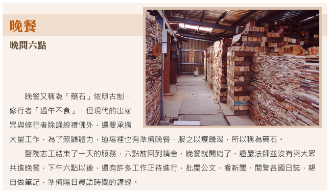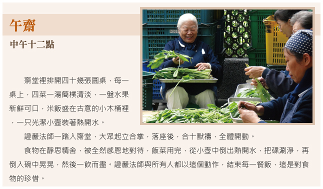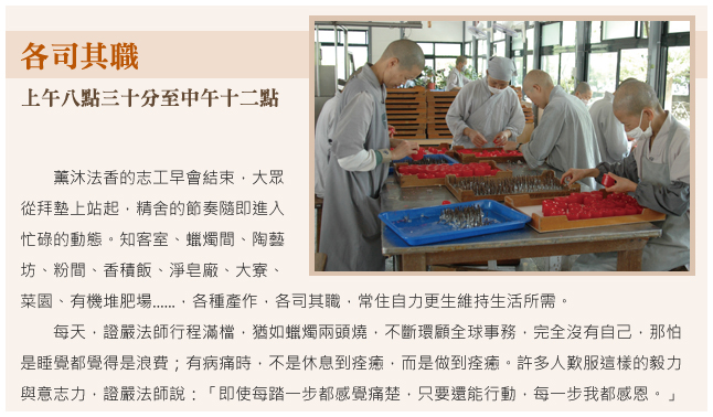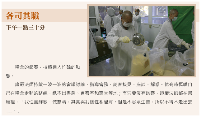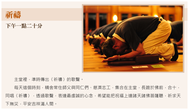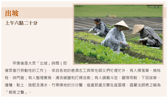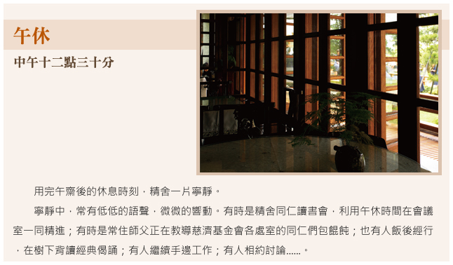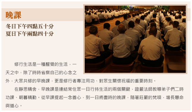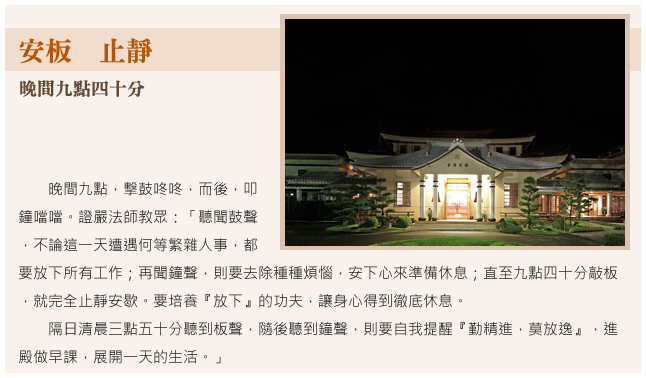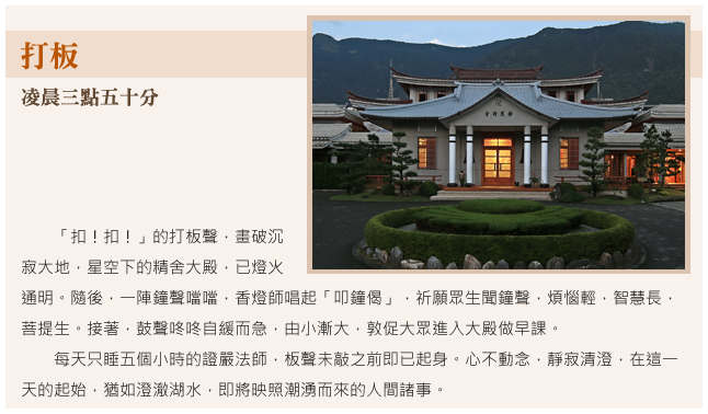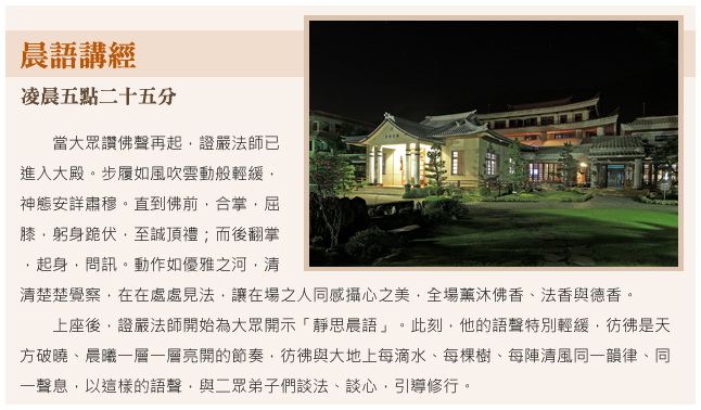 天邊透著微微曙光的時刻,師父走進主堂,在靜寂的氣氛中禮佛,然後入坐。早課中的大眾開始念佛,接著靜坐,在這短短的時間裡,闃暗天際浮現一條雪白銀帶,天色即將黎明。閉上眼睛,心靜,境亦靜。等到引磬聲響,張開眼睛,外面已是一片光明。