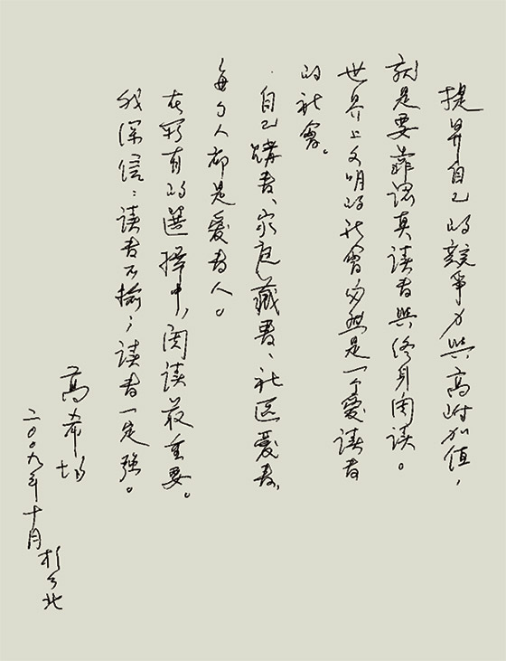 提昇人的競爭力、高附加價值,就是靠認真讀書,靠大量閱讀 世界上所有的文明社會,必然是一個愛讀書的社會 自己購書、家庭藏書、社區愛書,每個人都是終身閱讀者 在所有的選擇中,閱讀最重要。我深信:讀書不輸;讀書一定強