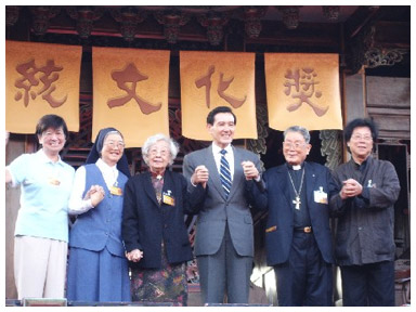 第5屆總統文化獎得獎主合影:左起余範英女士、湯靜蓮修女、齊邦媛老師、馬英九總統、單國璽樞機主教、吳靜吉教授。 |