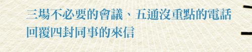 星期三早上九點,拉吉特端坐在筆電前,知道自己必須做一件事:完成兩天內要交給新客戶的提案。但三通電話、十五封郵件、兩次上廁所、三十分鐘訂家庭旅遊的機票,以及與四個員工的談話之後,他卻一個字都還沒開始寫。這時他的助理提醒他,十五分鐘內要赴一個午餐約會。這一天跑到哪裡去了?