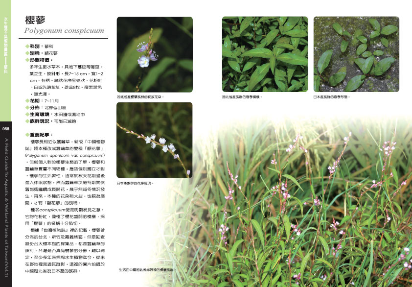 1995年的苗栗之行,在銅鑼鄉的水田環境見到大量的瓜皮草、直立半邊蓮、墨西哥節節菜、五蕊節節菜及擬長箭葉蓼。夏季的一趟新竹鴛鴦湖之行,觀察了四角藺、單穗苔、箭葉蓼及軟稈燈心草等溫帶植物的生態魅力。