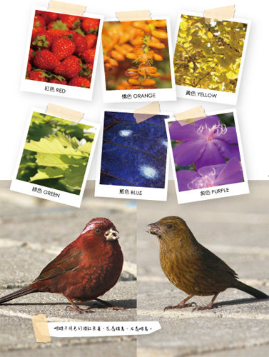 有些生物身上不同的色彩也許代表不同的品種或不同的性別,比如說山上的酒紅朱雀,雌雄不同色,暗紅色的是雄鳥而褐色的是雌鳥,常常有不明究理的人把牠們當成了不同種類的鳥!我在剛開始做自然觀察時,就是把牠們當成了兩種鳥類。不過在這裡要先強調一下,這樣的色彩區分不是絕對的喔!並不是所有生物的雌雄都有不同的顏色!