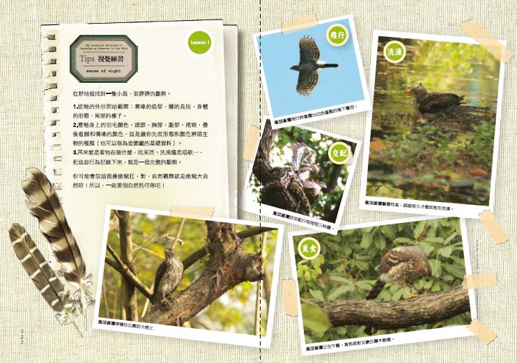 視覺練習:在野地裡找到一隻小鳥,並靜靜的觀察。從牠的外形開始觀察,嘴喙的造型,腳的長短,身體的形態,尾部的樣子;再來看牠身上的羽毛顏色,頭部、胸部、腹部、尾端,最後看腳和嘴喙的顏色,這是讓你先從形態和顏色辨認生物的種類(也可以做為查圖鑑的基礎資料)。再來就是看牠在做什麼,吃東西、洗澡還是唱歌…,把這些行為記錄下來,就是一個完整的觀察。你可能會說這很像偷窺狂,對,自然觀察就是偷窺大自然呀!