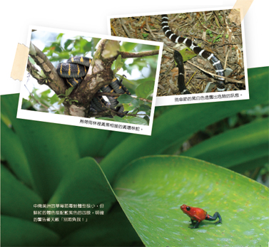 然而,顏色除透露生命的美麗訊息以外,生物也會透過它傳遞「危險」的訊號。黑白色彩交錯分佈的毒蛇—雨傘節,單看牠特殊的配色就讓人覺得不寒而慄。我在婆羅洲熱帶雨林曾經見到另一種毒蛇—黃環林蛇,身上的色彩黃黑交錯,更讓人覺得來者不善!看到牠也讓我終於明白路旁的護欄、電線桿為何要漆上黃、黑兩色的紋路,因為它正是「小心危險」的最佳提醒!不只是大型生物擁有警戒色,棲息在中南美洲體長約僅2公分的小小草莓箭毒蛙,也用鮮紅的體色搭配藍紫色的四肢,明確的警告著天敵「別欺負我個子小,我有毒,不要吃我!」。當我親眼見識過這些致命的色彩之後,也才理解為何人類總是愛用紅、黃、黑、白等顏色來彰顯危險了。