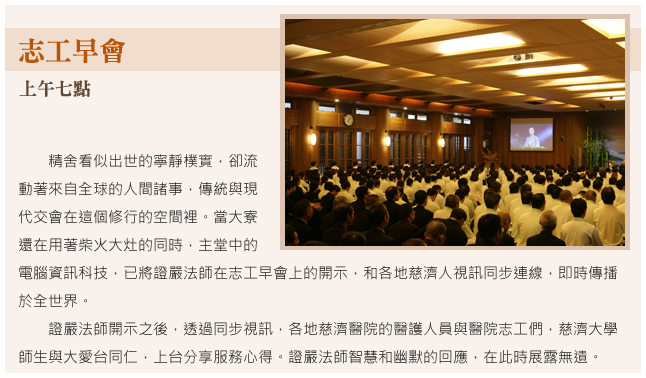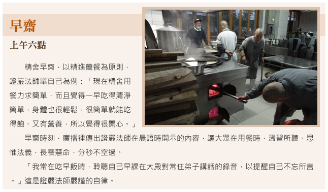 天邊透著微微曙光的時刻,師父走進主堂,在靜寂的氣氛中禮佛,然後入坐。早課中的大眾開始念佛,接著靜坐,在這短短的時間裡,闃暗天際浮現一條雪白銀帶,天色即將黎明。閉上眼睛,心靜,境亦靜。等到引磬聲響,張開眼睛,外面已是一片光明。
